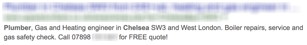 You can see this listing does a much better job of appealing to someone who is looking for a plumber in Chelsea, and it even gives their phone number in case the potential customer just wants to get in touch straight away. Not only is this a more appealing description, but it also does a good job of including the kind of search terms this page is trying to rank for – something you should always try and do if possible.